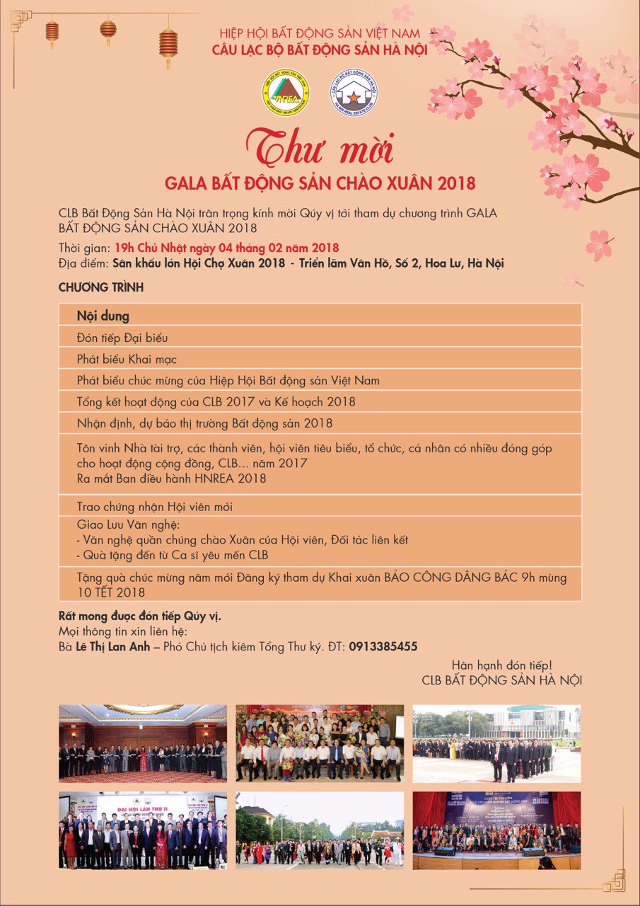 Hoà chung không khí cả nước đón chào mùa xuân mới. CLB BĐS HN cùng các đối tác liên kết: CLB Văn hoá Ứng xử, Hội Quý Bà, Hội Nữ nhân Hợp Phát, Hội Doanh nhân, Hội Truyền Thông TPHN tổ chức Chương trình:” GA LA BẤT ĐỘNG SẢN CHÀO XUÂN 2018 ” vào lúc 18h-22h, Chủ nhật, 4/2/2018 tại Triển Lãm Vân Hồ, 02 Hoa Lư, Hà nội.