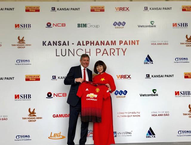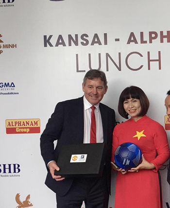 TGĐ Cty CP VIREX Lê Thị Lan Anh- Sứ Giả Kết Nối vui mừng nhận quà tặng đặc biệt của cựu danh thủ Bryan Robson – huyền thoại của CLB Manchester United nhân chuyến thăm Việt Nam chúc mừng sự kiện ra mắt sản phẩm mới của Kansai Paint – đối tác toàn cầu chính thức của MU và thăm các Công ty thành viên Tập đoàn Alphanam…