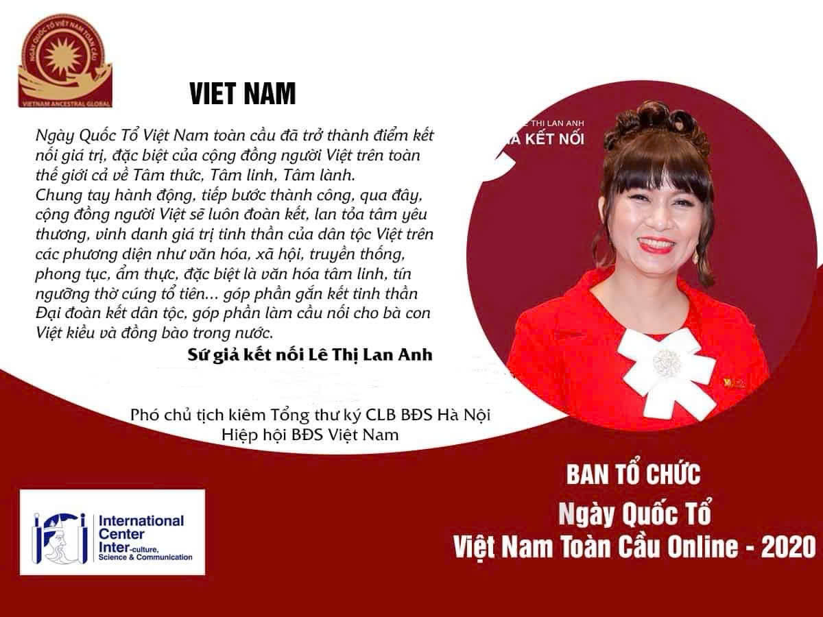 Ban Dự án Ngày Quốc Tổ Việt Nam toàn cầu xin trân trọng giới thiệu Ban tổ chức “Ngày Quốc Tổ Việt Nam toàn cầu online 2020“, gồm các nhà trí thức, lãnh đạo kiều bào của 16 nước trên thế giới. Nói như Đại thi hào Voltaire thì những vị “chính nhân quân tử“ này và các thành viên của Ban Dự án đã được “buộc lại” với nhau bởi lý tưởng và khát vọng chung về một Việt Nam vững mạnh trên trường quốc tế ! Tình yêu thiện nguyện và thuần khiết ấy đã khiến họ sẵn sàng hy sinh nhiều thứ để cống hiến tâm sức và trí tuệ cho Dự án này.